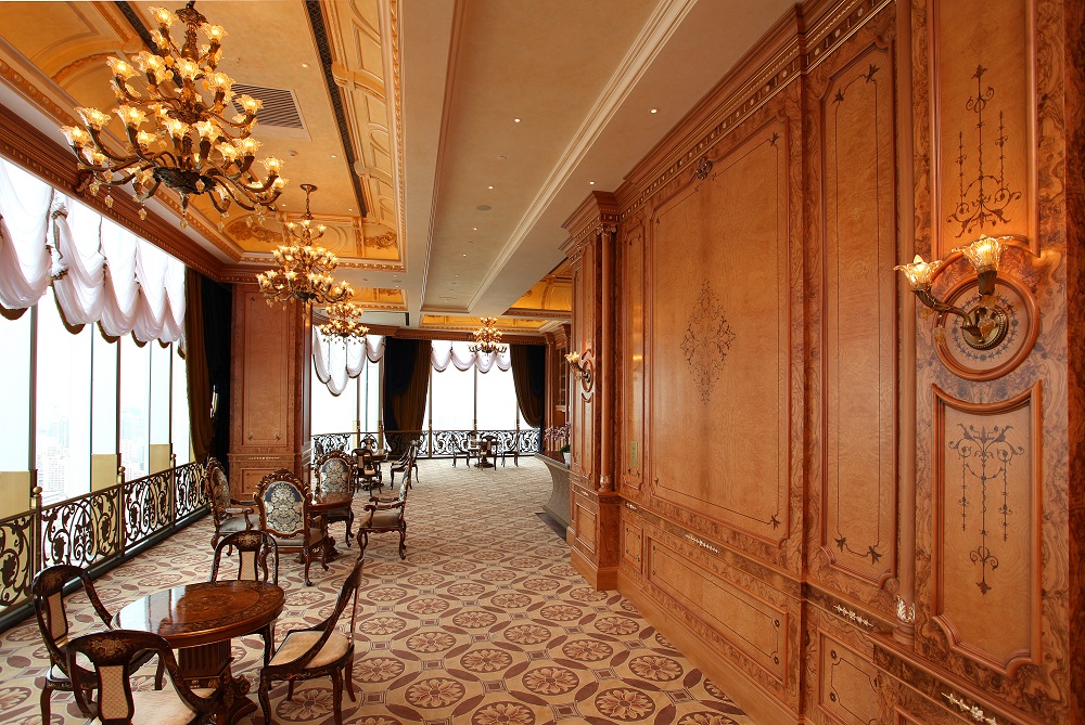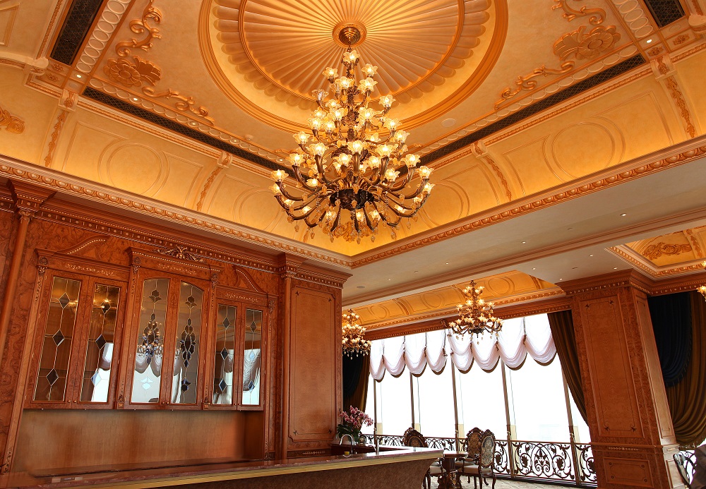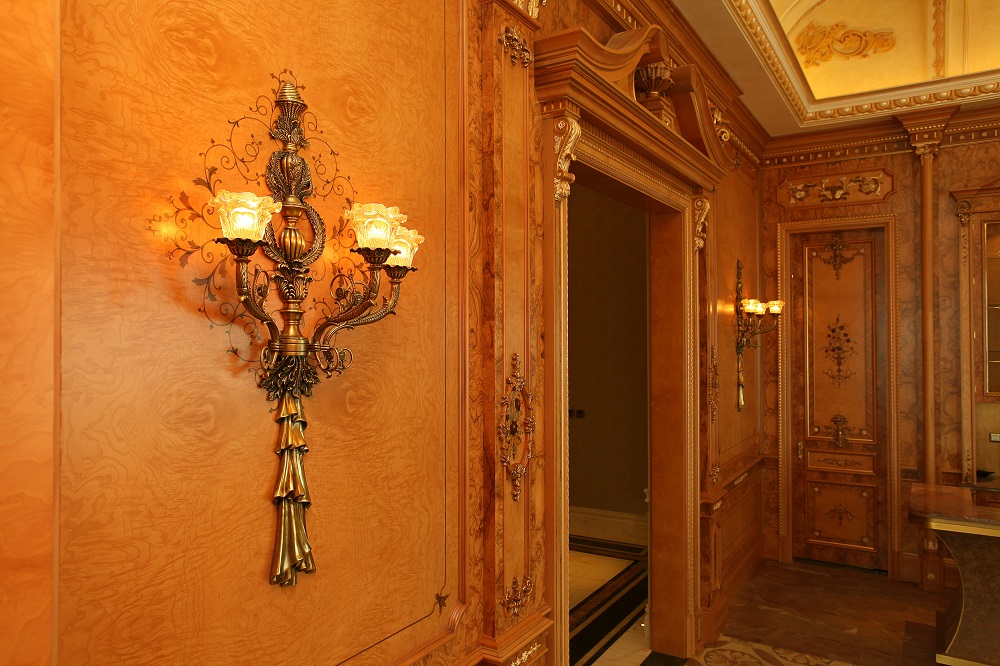 走近到空中會所,迎面而來的就是濃濃的歐洲古典氣息。茶色和金色的完美搭配,充滿洛可可時代的精致與奢華。獨具匠心的立體葉形雕花圖案,優(yōu)雅古典的銅藝壁燈,在詮釋法式浪漫典雅的同時,也帶給人如燈光微醺的溫馨感與舒適感。雄偉璀璨的法式全銅吊燈,與客廳整體色彩和裝飾風格相得益彰,呈現(xiàn)出凡爾賽宮殿式的金碧輝煌與尊貴感。法式宮廷洛可可風格壁燈,纖細、華麗、精美,采用S形和漩渦的曲線,描金的技法更加體現(xiàn)出精巧、細膩和繁瑣的美感。