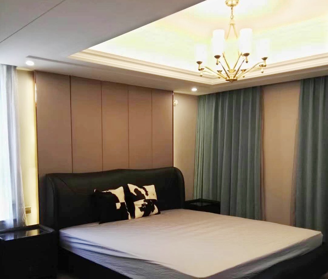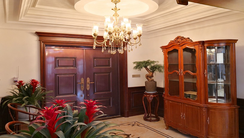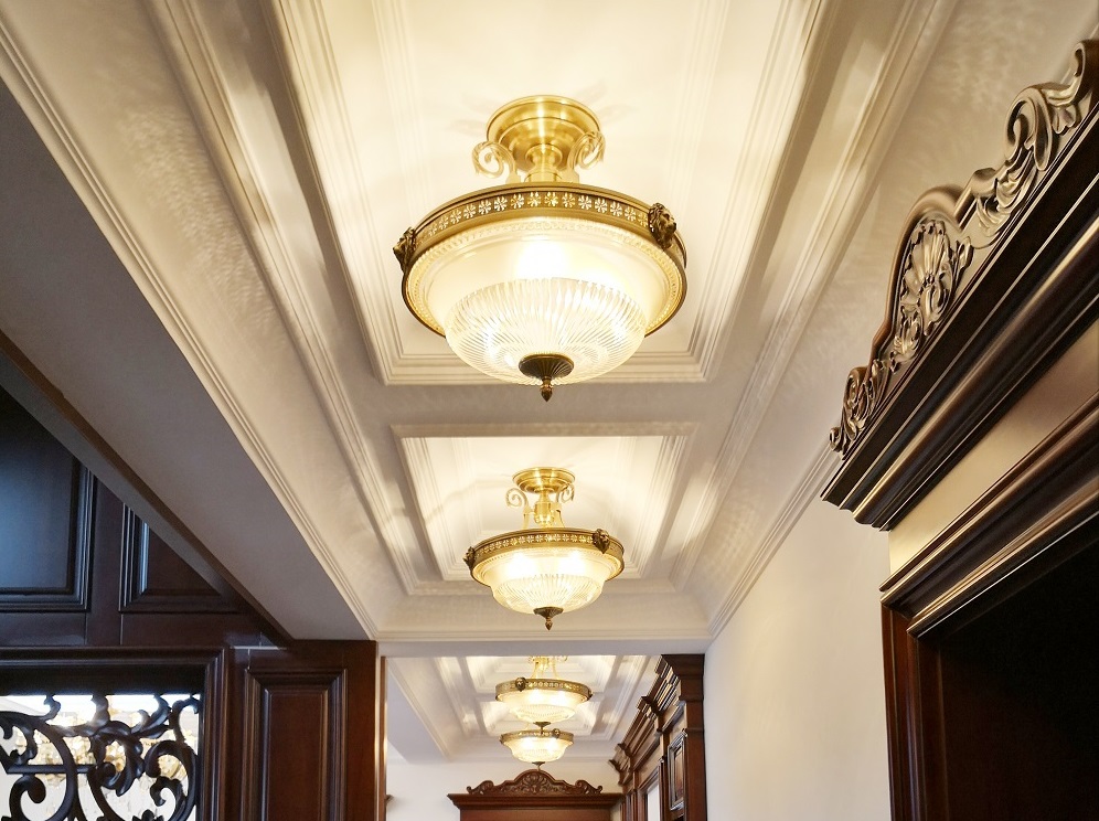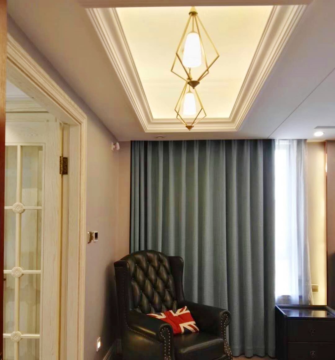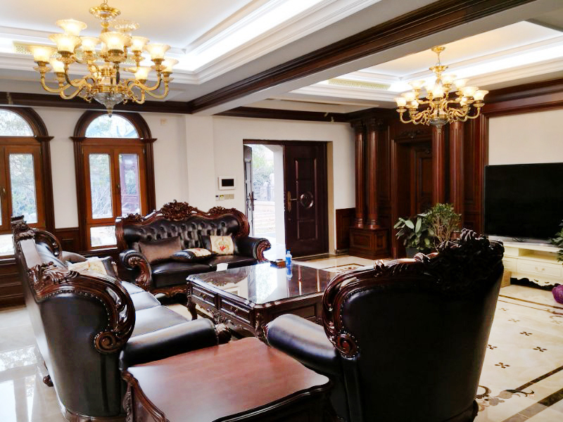入門小空間的布置精巧別致,復古的紅木家具搭配植物擺件,為現代化家居增添了幾分返璞歸真的意蘊。而S504308款吊燈的華美第一眼便帶給人驚艷,與奢華復古的家具完美搭配。 會客廳空間較大,布局簡練,全套實木家具,古樸厚重,奢華盡顯。兩盞全銅吊燈不僅完美滿足大空間的照明需求,也為客廳嚴肅凝重的氛圍增添幾分靈動。燈光柔和均勻傾瀉下來,將真皮沙發和實木家具的尊貴品質盡顯無遺。