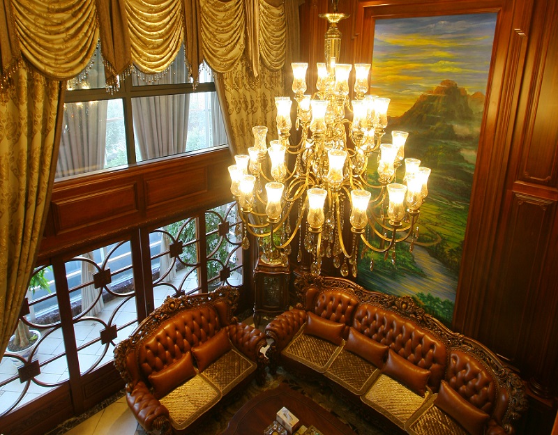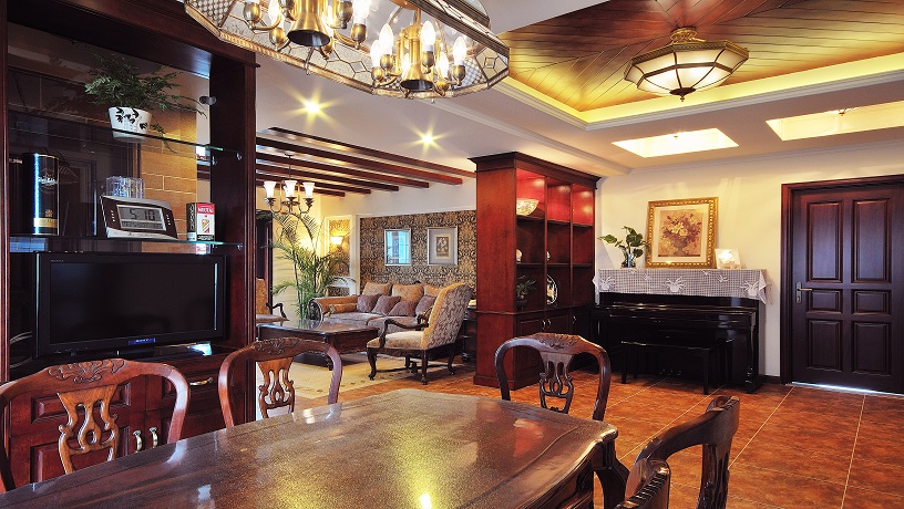 大氣恢宏的客廳,用紅木做出結實的框架,古典線條富有立體感,巨幅油畫對應長格中傳統吉祥圖案,天花以木條相交成方格形,簡單的格形的燈池吊頂,層次清晰,而極致奢華的層疊大吊燈,更顯主人的品位與尊貴,家具陳設對稱,文化韻味和獨特風格,體現中國傳統家居文化的獨特魅力。