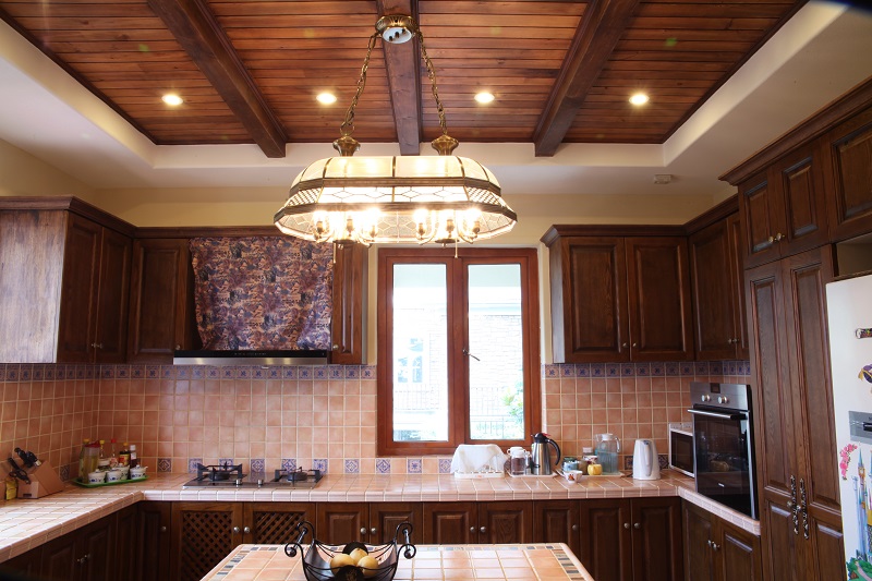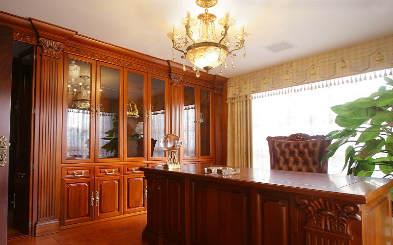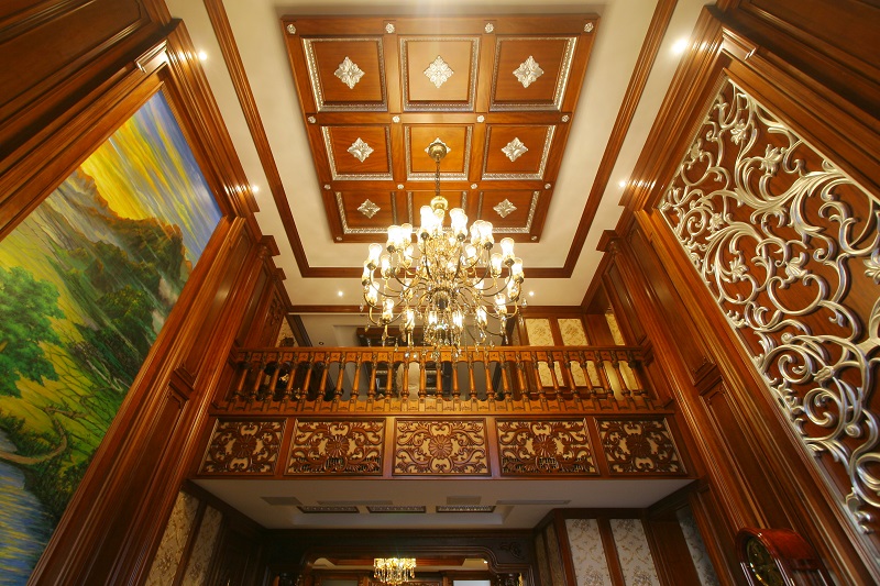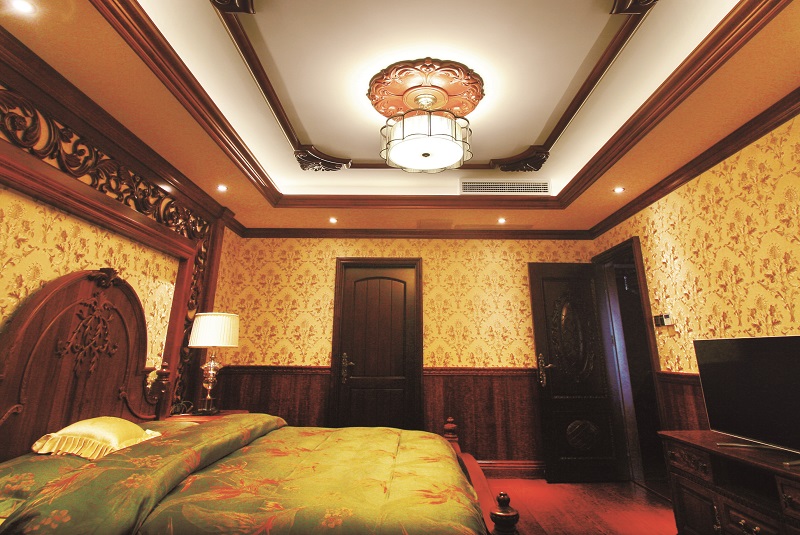 工藝精巧,外形別致,處處都表現出與自然間的融合。電視柜,地板,實木床,充滿了古色古香,甚至連床頭墻面的雕花,都富有中國傳統文化的韻味。而吊頂和燈飾的造型,則巧妙的詮釋了方與圓的藝術結合,光影間,滿室生輝。