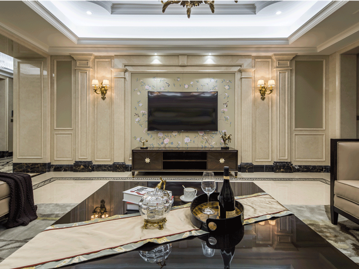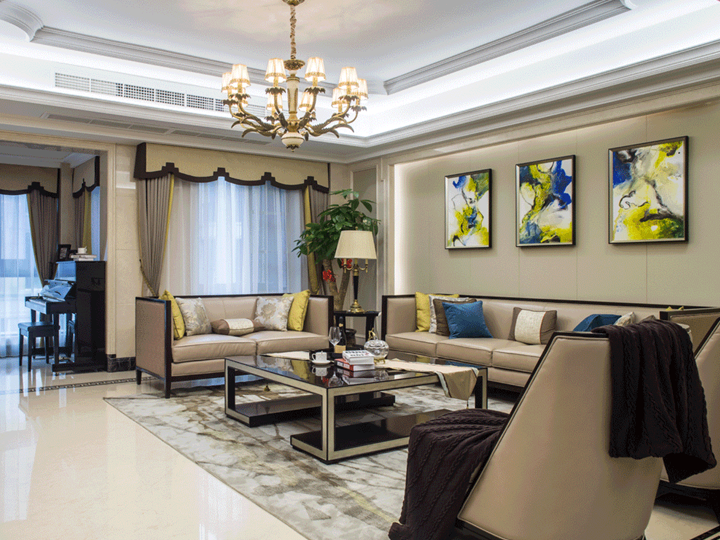 這是一個聯排復式別墅,走進客廳,目光所及之處都是景觀,不管從哪一個角度看去都無可挑剔。 美式咖色皮沙發環抱著大理石地面,在大面積淺咖色調中,幾抹鮮明的黃、藍色作為點綴。在全銅吊燈的照耀下,空間顯得豐滿而不擁擠,盡顯現代美式的隨性奢華。 走廊壁燈與客廳吊相呼應,采用絲綢燈罩全銅壁燈,將轉角處的溫柔與質感傳達到極致。