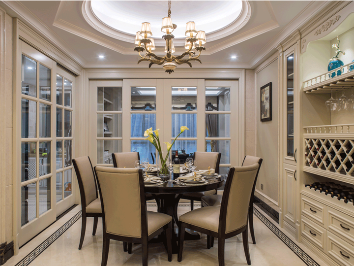 餐廳延續美式的整體風格,柔和的色調給人感覺清爽又舒適;多邊幾何與圓形拱吊頂,給諾克照明的全銅吊燈一個釋放光亮的入口,讓餐桌上的臻饕盛宴更加熱鬧。